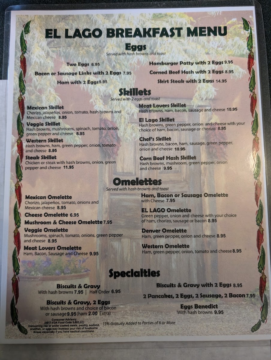 El Lago’s menu offers a comfortable blend of Mexican and classic breakfast dishes, perfect for starting the day or enjoying a casual lunch or dinner. The selection is approachable and made to suit a variety of tastes, whether you're in the mood for savory omelettes, traditional Mexican favorites, or a hearty skillet to energize your morning.
